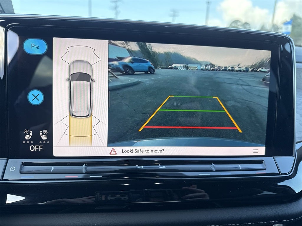 2nd-Row Dual Captain's Chairs, 3rd row seats: split-bench, 4-Wheel Disc Brakes, 4-Wheel Independent Suspension, 6 Speakers, ABS brakes, Air Conditioning, Alloy wheels, AM/FM radio: SiriusXM with 360L, Auto High-beam Headlights, Auto-dimming Rear-View mirror, Automatic temperature control, Brake assist, Bumpers: body-color, Compass, Delay-off headlights, Driver door bin, Driver vanity mirror, Dual front impact airbags, Dual front side impact airbags, Electronic Stability Control, Emergency communication system: VW Car-Net Safe & Secure 5-year, Extended Range Remote Key Fob (1), Exterior Parking Camera Rear, Four wheel independent suspension, Front anti-roll bar, Front Bucket Seats, Front Center Armrest, Front dual zone A/C, Front fog lights, Front reading lights, Fully automatic headlights, Garage door transmitter: HomeLink, Heated & Actively Ventilated Front Bucket Seats, Heated door mirrors, Heated front seats, Heated steering wheel, Illuminated entry, Low tire pressure warning, Occupant sensing airbag, Outside temperature display, Overhead airbag, Overhead console, Panic alarm, Passenger door bin, Passenger vanity mirror, Perforated V-Tex Leatherette Seating Surfaces, Power door mirrors, Power driver seat, Power Liftgate, Power steering, Power windows, Radio data system, Radio: MIB3 Composition Media, Rain sensing wipers, Rear air conditioning, Rear anti-roll bar, Rear reading lights, Rear seat center armrest, Rear window defroster, Rear window wiper, Remote keyless entry, Security system, Speed control, Speed-sensing steering, Split folding rear seat, Spoiler, Steering wheel mounted audio controls, Tachometer, Telescoping steering wheel, Tilt steering wheel, Traction control, Trip computer, Turn signal indicator mirrors, Variably intermittent wipers, Ventilated front seats, Volkswagen Logo Puddle Lights, VW Care, Wheel Splash Guards (Set of 4), and Wheels: 20 2-Tone Machined AlloY.