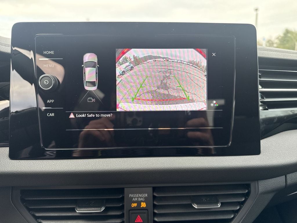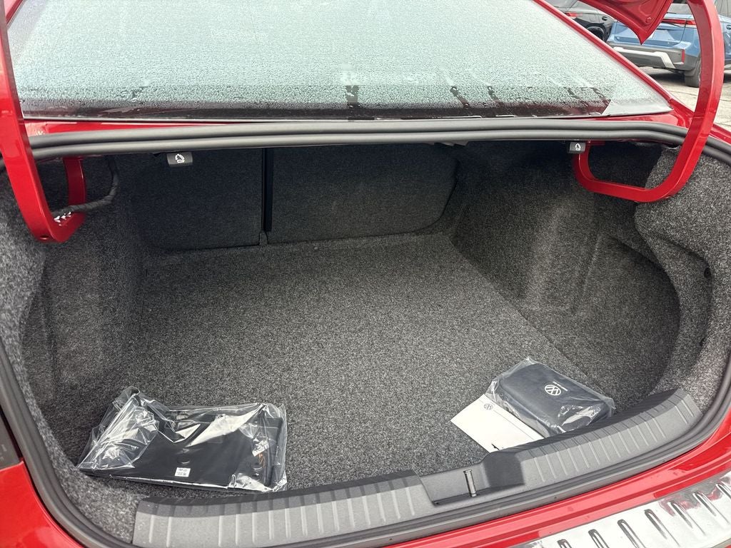 Cloth, 4 Speakers, 4-Wheel Disc Brakes, ABS brakes, Active Blind Spot Monitor, Air Conditioning, Alloy wheels, Auto-dimming Rear-View mirror, Auto-Dimming Rearview Mirror with HomeLink, Automatic temperature control, Black Trunk Lid Lip Spoiler, Brake assist, Bumperdillo Protection Plate in Chrome For Rear Bumper, Bumpers: body-color, Cloth Seat Trim, Delay-off headlights, Driver door bin, Driver vanity mirror, Dual front impact airbags, Dual front side impact airbags, Electronic Stability Control, Emergency communication system: VW Car-Net Safe & Secure 5-year, Exterior Parking Camera Rear, Front anti-roll bar, Front Bucket Seats, Front Center Armrest, Front dual zone A/C, Front wheel independent suspension, Fully automatic headlights, Heated door mirrors, Heated Front Seats, Heated front seats, Illuminated entry, Leather Shift Knob, Leather steering wheel, Low tire pressure warning, Occupant sensing airbag, Outside temperature display, Overhead airbag, Overhead console, Panic alarm, Passenger door bin, Passenger vanity mirror, Power door mirrors, Power steering, Power windows, Radio data system, Radio: MIB3 Composition Color with 8 Touchscreen, Rain sensing wipers, Rear anti-roll bar, Rear reading lights, Rear seat center armrest, Rear window defroster, Remote keyless entry, Speed control, Speed-sensing steering, Split folding rear seat, Steering wheel mounted audio controls, Tachometer, Telescoping steering wheel, Tilt steering wheel, Traction control, Trip computer, Variably intermittent wipers, VW Care, and Wheels: 17 2-Tone Machined AlloY.