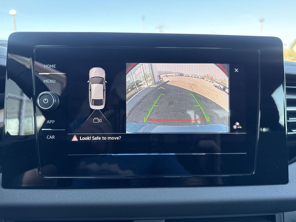 Cloth, 4 Speakers, 4-Wheel Disc Brakes, ABS brakes, Active Blind Spot Monitor, Air Conditioning, Alloy wheels, Auto-dimming Rear-View mirror, Auto-Dimming Rearview Mirror with HomeLink, Automatic temperature control, Brake assist, Bumpers: body-color, Cloth Seat Trim, Delay-off headlights, Driver door bin, Driver vanity mirror, Dual front impact airbags, Dual front side impact airbags, Dynamic Wheel Center Caps (set of 4), Electronic Stability Control, Emergency communication system: VW Car-Net Safe & Secure 5-year, Extended Range Remote Engine Start, Exterior Parking Camera Rear, Front anti-roll bar, Front Bucket Seats, Front Center Armrest, Front Center Armrest Storage Organizing Trays, Front dual zone A/C, Front wheel independent suspension, Fully automatic headlights, Heated door mirrors, Heated Front Seats, Heated front seats, Illuminated entry, Leather Shift Knob, Leather steering wheel, Low tire pressure warning, Occupant sensing airbag, Outside temperature display, Overhead airbag, Overhead console, Panic alarm, Passenger door bin, Passenger vanity mirror, Power door mirrors, Power steering, Power windows, Radio data system, Radio: MIB3 Composition Color with 8 Touchscreen, Rain sensing wipers, Rear anti-roll bar, Rear reading lights, Rear seat center armrest, Rear window defroster, Remote keyless entry, Speed control, Speed-sensing steering, Split folding rear seat, Steering wheel mounted audio controls, Tachometer, Telescoping steering wheel, Tilt steering wheel, Traction control, Trip computer, Variably intermittent wipers, VW Care, and Wheels: 17 2-Tone Machined AlloY.