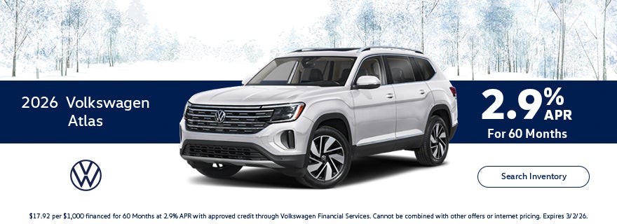 2.9% APR for 60 months on a new 2026 Volkswagen Atlas for well-qualified buyers.