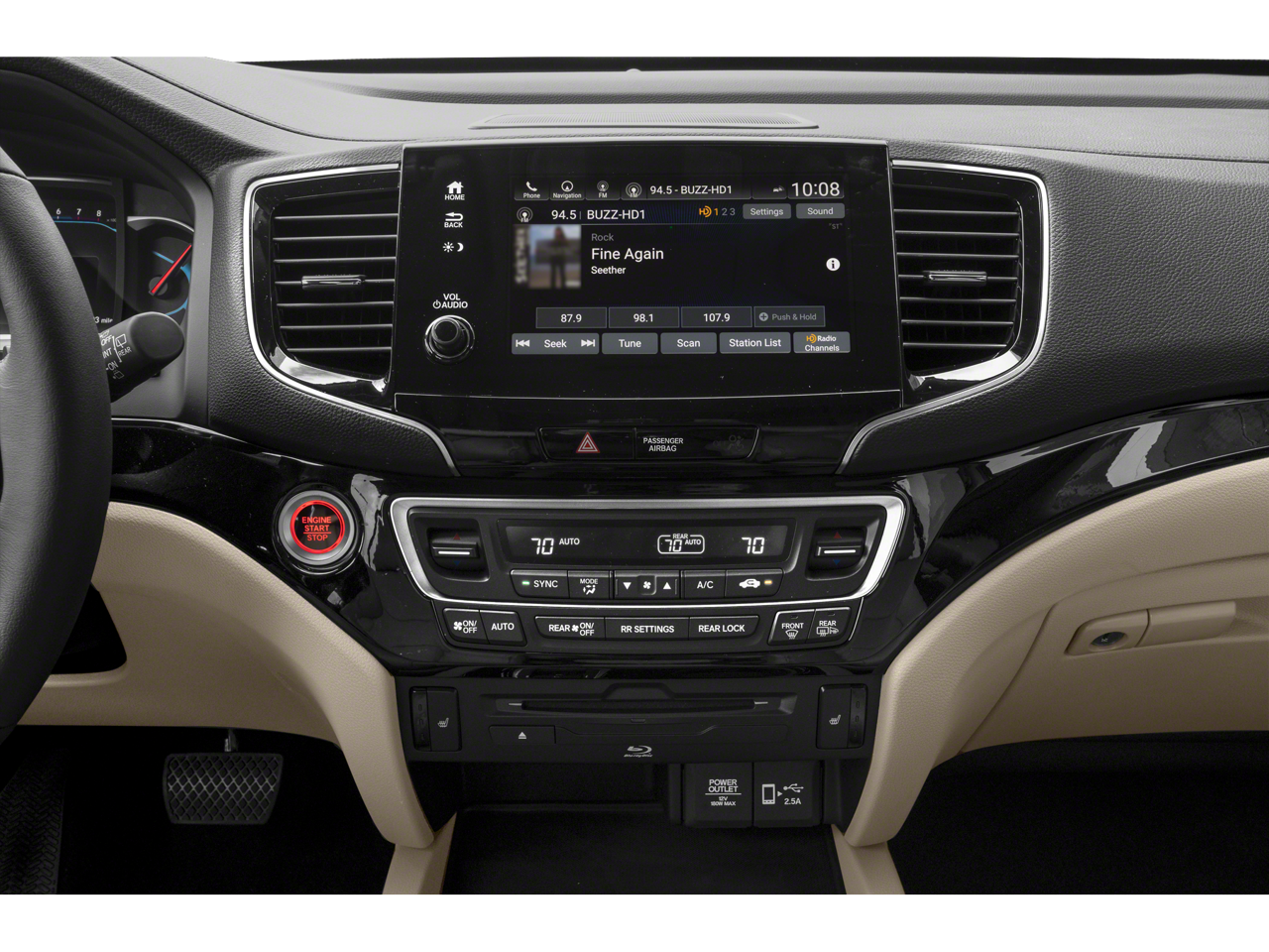 - Radio: 590-Watt Premium Audio System -inc: 10 speakers, subwoofer, Bluetooth® HandsFreeLink and streaming audio, MP3/auxiliary input jack, Radio Data System (RDS), Speed-sensitive Volume Compensation (SVC), 2.5-amp USB charging port (1 port in center console/2 ports on 2nd-row), 8" display audio w/high-resolution touch-screen and customizable feature settings, HondaLink, CabinControl remote compatibility, Apple CarPlay integration, Android Auto integration, SMS text message function, SiriusXM (SiriusXM requires a subscription after any trial period, If you decide to continue your SiriusXM service at the end of your trial subscription, the plan you choose will automatically renew and bill at then-current rates until you call SiriusXM at 1-866-635-2349 to cancel, See our customer agreement for complete terms at www.siriusxm.com, Fees and programming subject to change, Available in the 48 contiguous United States and D.C, SiriusXM and all related marks and logos are trademarks of SiriusXM Radio Inc.), HD radio, 2.5-amp USB smartphone/audio interface (1 port in front console), Honda Satellite-Linked Navigation System w/voice recognition and Honda HD digital traffic, advanced rear entertainment system w/10.2" high-resolution screen, Blu-Ray player, built-in streaming apps and 2 wireless headphones, HondaLink subscription services, Wi-Fi hotspot capability, multi-zone audio and CabinTalk In-Car PA system through headphones and speakers